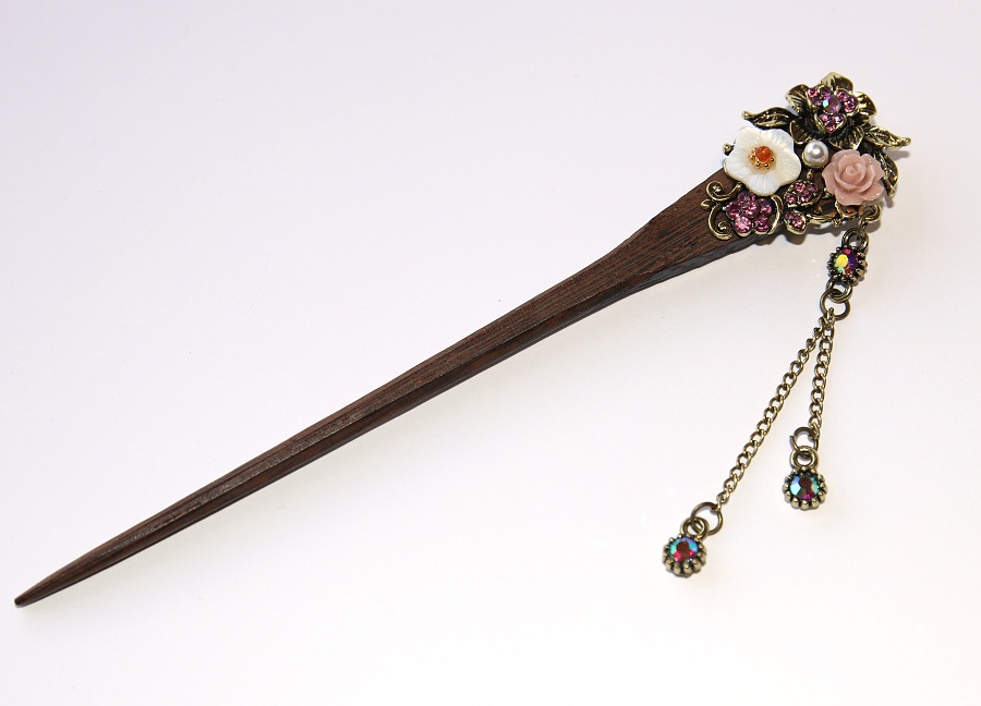 Nádherná, dřevěná jehlice do vlasů, která je zdobená překrásnými korálky a květinami. Volně vysící řetízky zakončené elegantními korálky jen podtrhují celou parádu a dodávají účesu naprosto luxusní nádech ♥